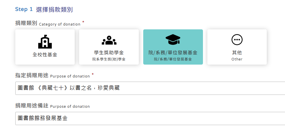 3.指定捐贈用途 ►『 圖書館《典藏七十》以書之名,珍愛典藏 』► 捐款用途備註『圖書館館務發展基金』► 並於最下方備註說明填寫『 圖書編號(001)或想認捐書名 』